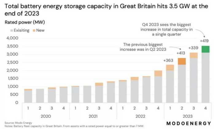 能源研究咨询机构Modo Energy公司日前证实,英国在2023年第四季度开通运营了420 MW电池储能系统。其装机容量与上一季度相比 ......