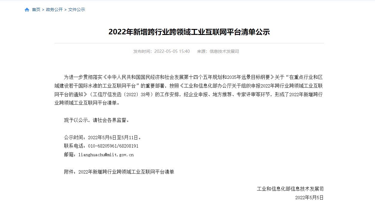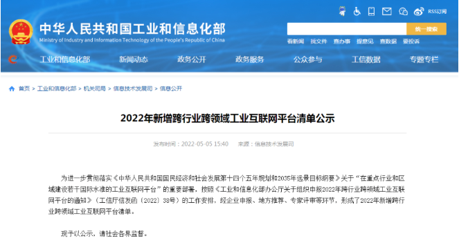 5月5日消息,今日,工信部公布《2022年新增跨行业跨领域工业互联网平台清单公示》,2022年共新增14家跨行业跨领域工业互联网 ......