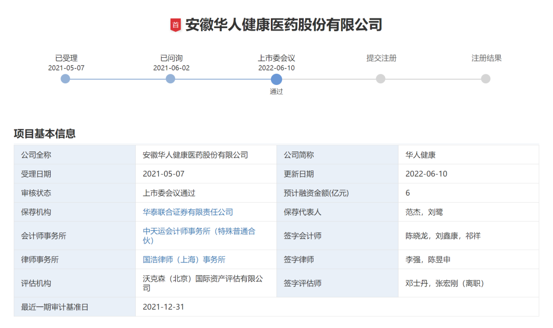 安徽华人健康医药股份有限公司IPO过会