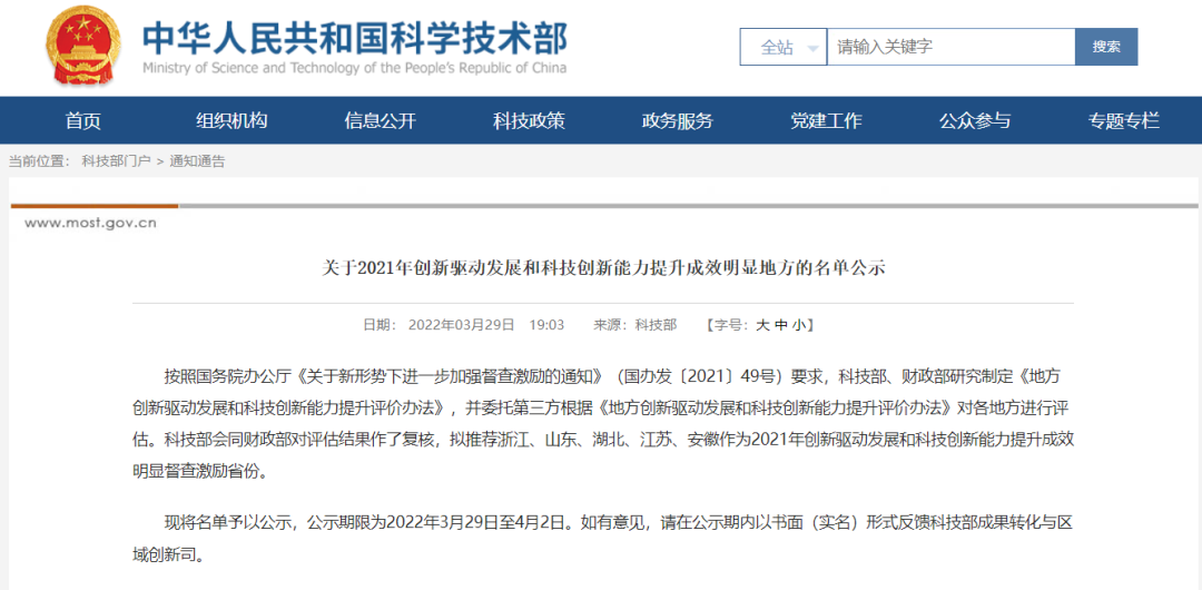 3月29日晚,国家科技部官网公示了2021年创新驱动发展和科技创新能力提升成效明显地方的名单,全国共五省上榜,安徽名列其中。......