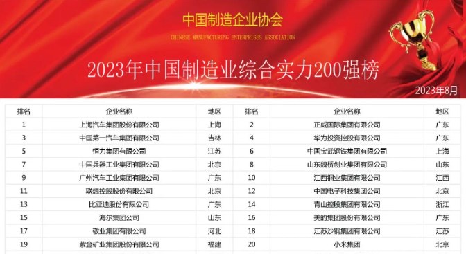 中国制造企业协会最新发布2023年《中国制造业综合实力200强》排行榜,上榜企业总部所在地涉及26个省、自治区、直辖市。鲁、 ......