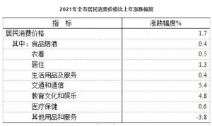 全年居民消费价格比上年上涨1.7%,其中食品烟酒价格上涨0.4%。