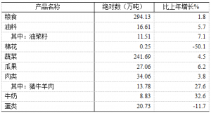 年末生猪存栏量84.8万头,比上年增长31.1%;出栏量158万头,增长24.9%。肉类总产量34.06万吨,增长3.8%,其中猪牛羊肉产量13.78万吨,增长27.6%。禽蛋产量20.73万吨,下降11.7%。牛奶产量8.83万吨,增长32.6%。