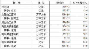 全年房地产开发投资1466.42亿元,比上年下降5.2%;其中住宅投资1193.17亿元,下降3.6%。新建商品房销售面积1836.59万平方米,增长23.6%;商品房销售额2457.72亿元,增长15.5%;年末商品房待售面积357.27万平方米,增长30.5%。