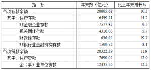 年末全市金融机构本外币各项存款余额20605.68亿元,比上年末增加1930.37亿元,增长10.3%。其中,住户存款6439.21亿元,增长14.2%;非金融企业存款7577.89亿元,增长9.5%;机关团体存款4310亿元,增长5.7%;财政性存款636.94亿元,增长19.7%。年末金融机构本外币各项贷款余额20322.39亿元,比上年末增加2155.82亿元,增长11.9%。其中,住户贷款7690.02亿元,增长12%;企(事)业单位贷款12435.56亿元,增长12.2%。