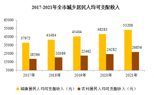 按常住地分,城镇常住居民人均可支配收入53208元,比上年增长10.2%。人均消费支出32445元,增长15.9%。其中,食品烟酒支出增长11.0%,衣着支出增长14.5%,居住支出增长11.0%,生活用品及服务支出增长20.3%,交通通信支出增长14.3%,教育文化娱乐支出增长40.2%,医疗保健支出增长14.8%,其他商品及服务支出增长31.2%。城镇常住居民恩格尔系数为27.7%,比上年下降1.2个百分点。年末城镇常住居民人均住房建筑面积34.15平方米,比上年末下降0.7平方米。