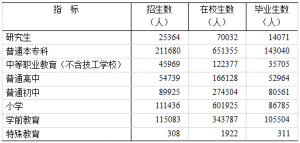 年末全市各类高等院校60所(含成人高校),其中研究生培养院校9所。全年研究生教育招生2.54万人,在校研究生7.0万人,毕业生1.41万人。普通本专科招生21.17万人,在校生65.14万人,毕业生14.3万人。中等职业教育学校(不含技工学校)50所,在校生12.24万人。普通高中104所,在校生16.61万人,高中阶段毛入学率130.61%。普通初中235所,在校生27.45万人,初中阶段毛入学率112.86%。小学466所,在校生60.19万人,小学毛入学率109.45%。幼儿园1407所,在园幼儿34.38万人。全市义务教育经费保障机制改革惠及学生84.23万人,其中城市34.01万人、农村50.22万人。