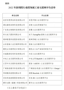 为进一步贯彻落实《中华人民共和国国民经济和社会发展第十四个五年规划和2035年远景目标纲要》关于“在重点行业和区域建设若干国际水准的工业互联网平台”的重要部署,按照《工业和信息化部办公厅关于组织申报2022年跨行业跨领域工业互联网平台的通知》工作安排,经企业申报、地方推荐、专家评审等环节,形成了2022年新增跨行业跨领域工业互联网平台清单。